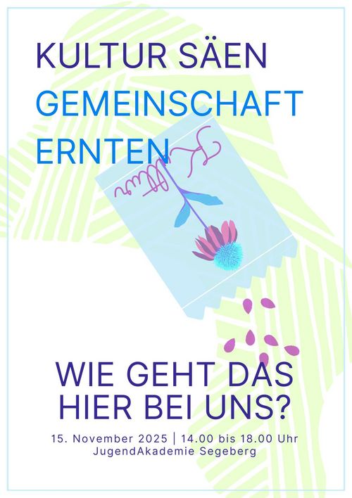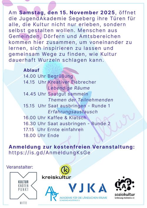 Am 15. November 2025 laden wir euch in die JugendAkademie Segeberg ein, um gemeinsam Ideen für eine lebendige Kulturlandschaft im ländlichen Raum zu entwickeln. Eingeladen sind Engagierte aus Gemeinden, Dörfern und Amtsbereichen, die sich austauschen, voneinander lernen und gemeinsam Wege finden möchten, wie Kultur vor Ort nachhaltig wachsen kann.